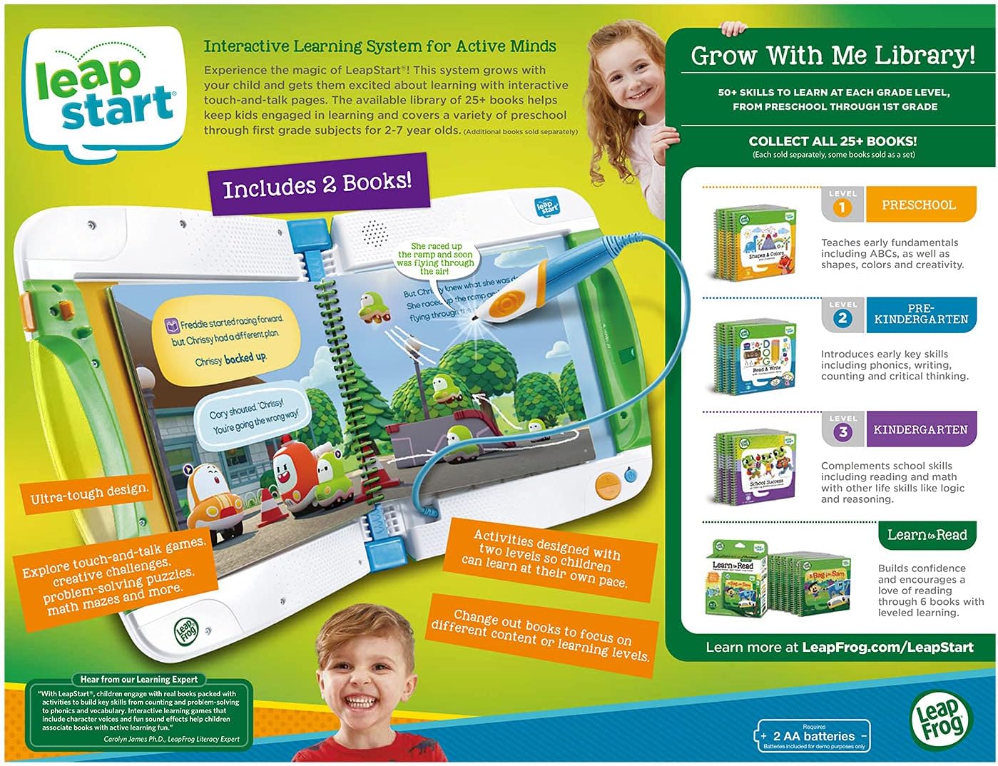 Explore exciting new ways to learn with the LeapStart Learning Success Bundle interactive system. This system with a sleek, new design grows with your child and gets them excited about learning with interactive touch-and-talk pages. Activities that include games, puzzles and creative challenges enhance learning to help kids build math, reading, problem-solving skills and more. The Go! Go! Cory Carson Cory Carson Superhero School book, based on the popular animated series, and an additional activity book are included.